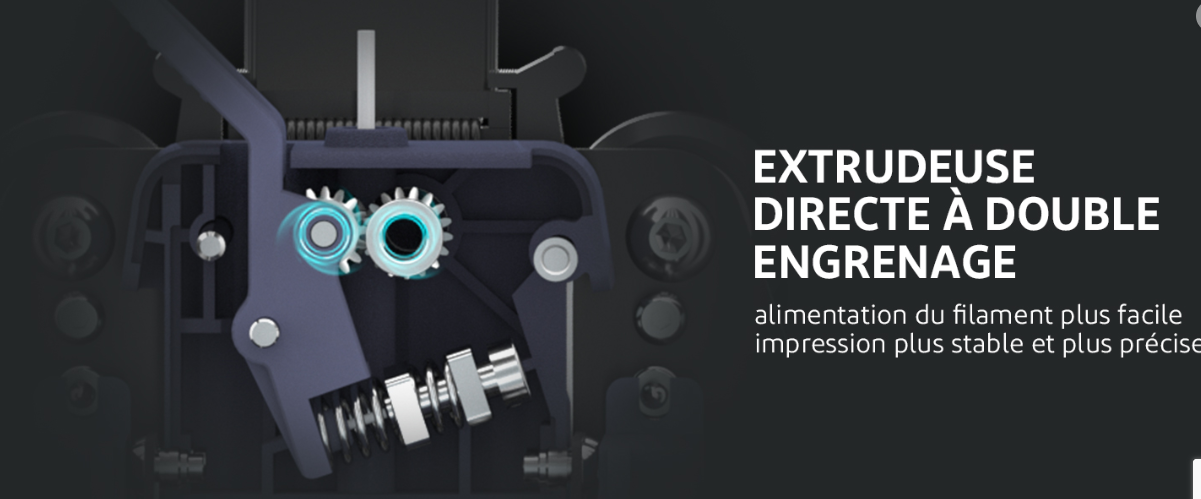 Extrudeuse directe à double engrenage avec moteur à couple d’extrusion 3 fois, fonctionne avec un tuyau de gorge en alliage de titane pour une alimentation plus facile du filament et une impression plus stable et précise. Et le lit de 250 W peut chauffer rapidement jusqu’à 100 °C.