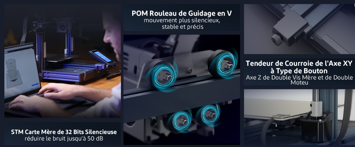 L’ensemble de la machine adopte des pilotes silencieux de carte mère STM 32 bits et une structure de dissipation thermique de buse plus raisonnable, réduisant le bruit jusqu’à 50 dB. Les roues à fente en V POM résistantes à l’usure se déplacent silencieusement, en douceur et avec précision.
